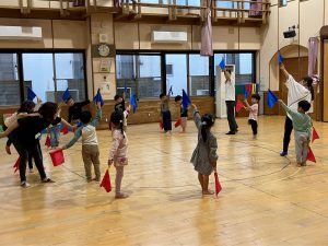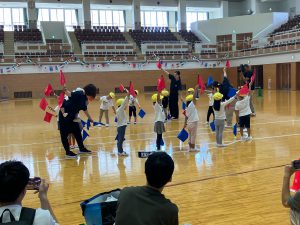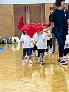 次は、たんぽぽ組さんです♪赤と青の旗を持って、かっこいいダンスを見せてくれました。