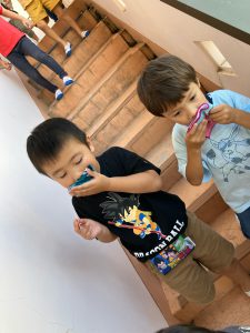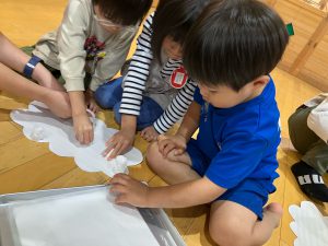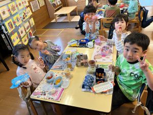 おみやげの「塩マラカス」をもらって嬉しそうにしていました。塩マラカスでたくさん遊んで色の変化をたのしんでくださいね。