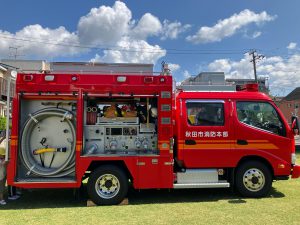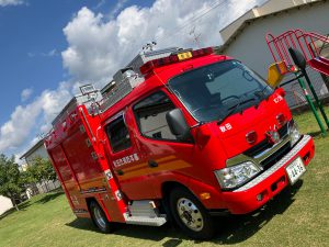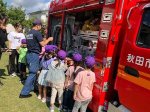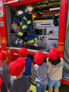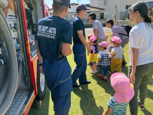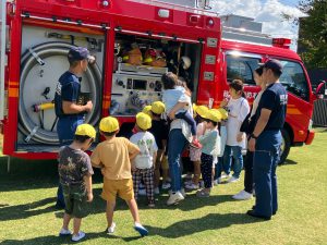 避難訓練後は、消防車の見学タイム!! 消防車の気になることを質問しているお友達もいましたよ。
