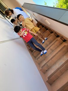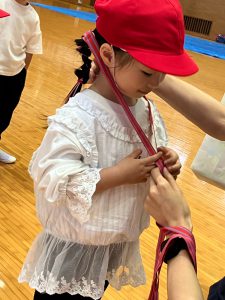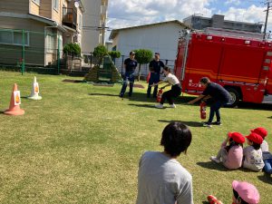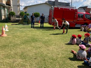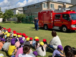 2025年09月26日今日は、消防士さん立ち合いのもと、火災想定の避難訓練を行いました。避難中は、煙を吸い込まないように、ハンカチや手で口と鼻を塞ぐことができていました。今回は、自由遊び中の避難となり、2階のお部屋で遊んでいたお友達は非常階段から避難をしました。初めて通るお友達もいましたが、慌てずに避難することができました。