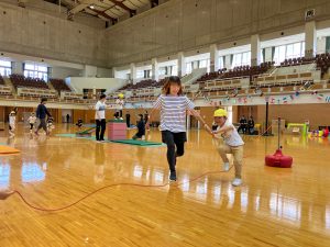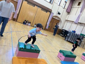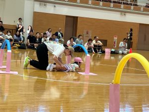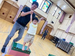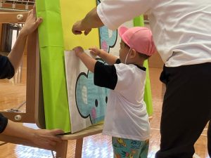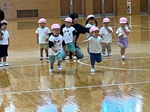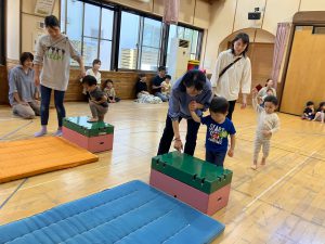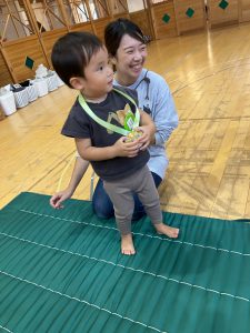 2025年09月11日今回のぴょんぴょんくらぶでは、ミニ運動会を楽しみました。最初は、マント、ベルト、お面をつけたアンパンマンに変身しましたよ。それから、一本橋を渡って、最後は、お母さんに抱っこしてもらって玉入れを頑張りました。ゴールして嬉しそうにしていました。