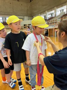 ミニミニ運動会を頑張ったみんなにはキラキラシャカシャカメダルのプレゼントです。