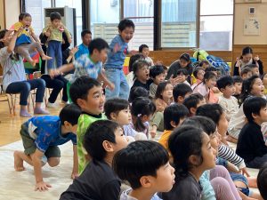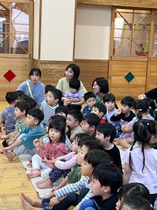 続いて、年長組さんの「見つからない」のダンスを見た後、「からだダンダン」のダンスを一緒に踊って楽しみました。そして、「いいおかお」という絵本も見ました。