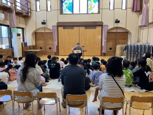 お誕生日の聖句や賛美歌、秋田幼稚園の園歌も元気いっぱい歌いました。120年変わらずにお側で見守り、支えてくれているイエスさま。これからもイエスさまとともに歩んでいきたいと思います。