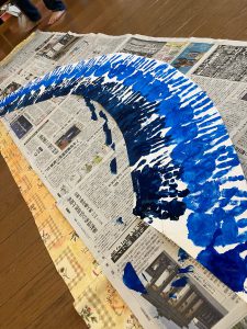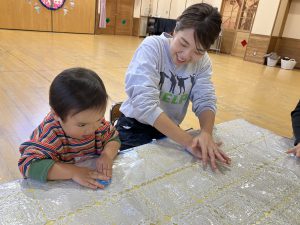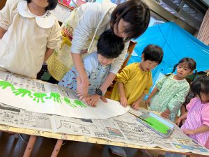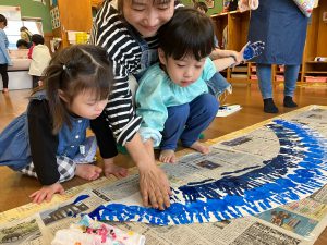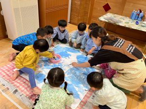 その後には、グループに分かれお花紙や絵の具で、虹がかかる青空と雲、
