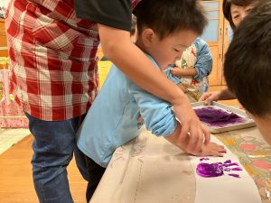 絵本を見る時も、アンパンマンになったままのお友達でした。「なでなでなーで」の絵本では、大好きなお母さんと触れ合いながら親子でゆったりしたひと時でした。
