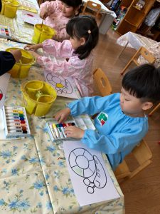 好きな色を使って自分のお顔や僕の私の好きな物など、自由に描き表していました。みんな画用紙いっぱいに描けていますね🖌