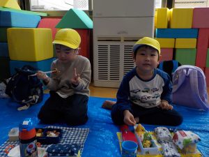 保育室から廊下に場所を移動し、キャンプごっこをしていました。