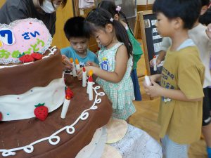 今日は、みんなでスタンプ遊びをして、風鈴を作りました。スポンジで作ったスタンプをポンポンと押して、カラフルな模様になりました。乾かしたものを紙コップの風鈴に貼り付けて、自分だけの素敵な風鈴が完成しました。この夏、風鈴の優しい音色で涼しく過ごせたらいいなと思います。